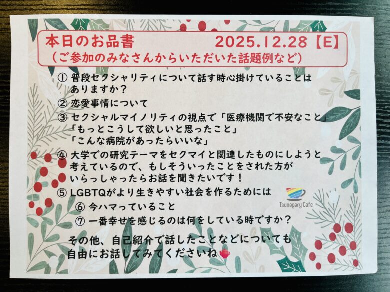 【E】12/28(日)Tsunagary Cafe for everyone(京都)、京都市内・木屋町御池周辺のレンタルスペースで開催し、申込ベースで満席14名(初めて方は4名)の方がご参加くださいました😊