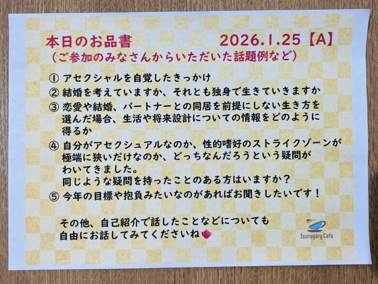 【A】1/25(日)Tsunagary Cafe for A(大阪)は、大阪市内・中津周辺のレンタルスペースで開催し、申込ベース満席14名(初めての方5名)の方がご参加くださいました🍀