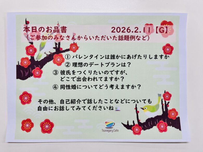 開催レポート2026.02.11開催レポート|【G】2/11(水祝)Tsunagary Cafe for G(大阪) ポスト シェア はてブ 送る Pocket【G】2/11(水祝)Tsunagary Cafe for G(大阪)は、大阪市内・鶴橋~上本町周辺のレンタルスペースで開催し、満席20名(初めて方は2名)の方がご参加くださいました🐈いつも来てくださるメンバー、何度か来てくださっている方、初めての方など、みなさんの交流の輪が広がっていました🫶🏻今回もたくさんのご参加をいただき、ありがとうございました💝✨