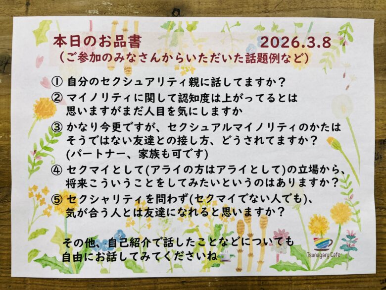 3月8日(日)に、大阪・天満橋にあるプライドセンター大阪で「Tsunagary Cafe for everyone」を開催しました!